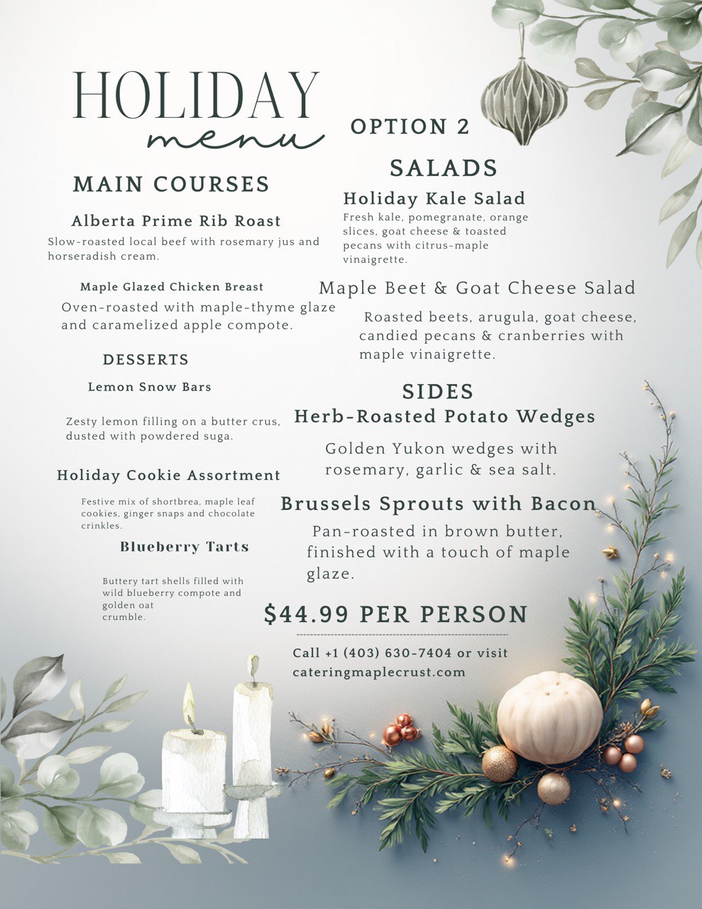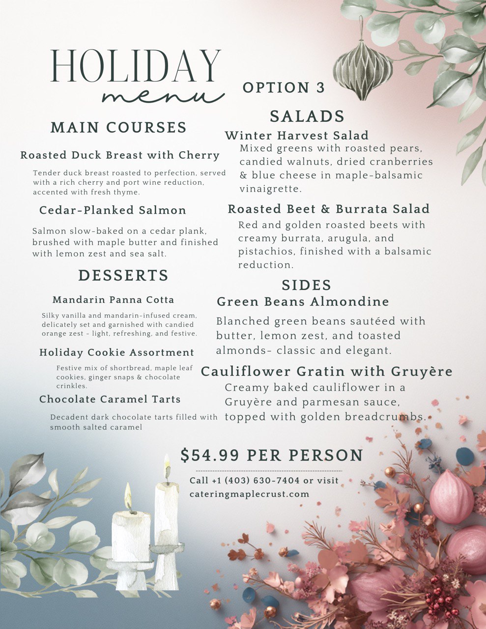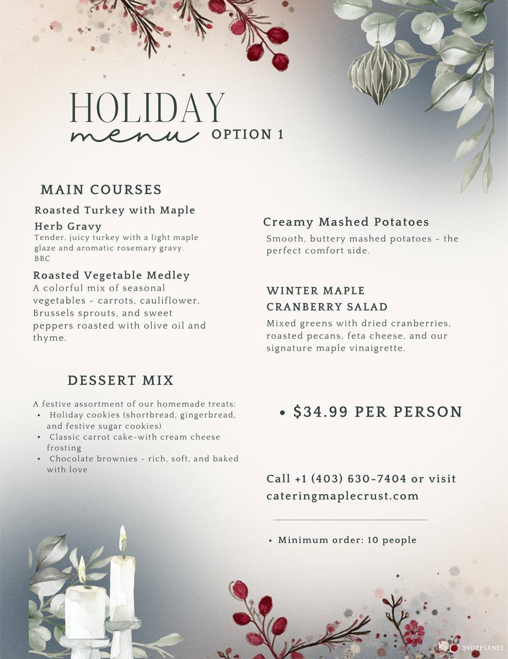 Celebrate the season with our Holiday Menu — a delicious blend of festive classics and modern flavors. Perfect for office parties, family gatherings, or elegant winter events. Made with love, served with joy, and designed to make every table shine.
